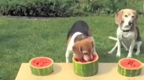 3. 团队吃瓜:两只狗狗合作,共同完成吃瓜任务。