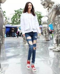 1. 简约风格:白色外套搭配牛仔裤和运动鞋,简约而不失时尚感。